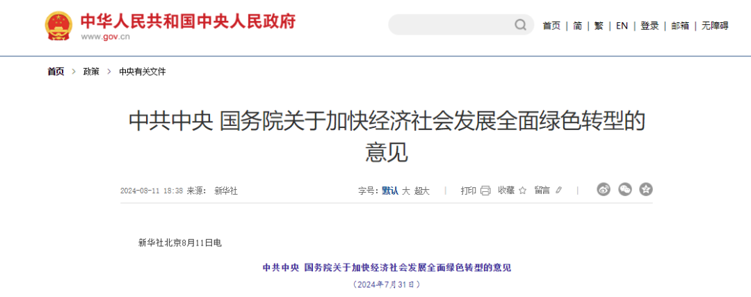 中国政府网于8月11日发布《中共中央?国务院关于加快经济社会发展全面绿色转型的意见》,全文如下:中共中央 国务院关于加快经济社会发展全面绿色转型的意见推动经济社会发展绿色化、低碳化,是新时代党治国理政新理念新实践的重要标志,是实现高质量发展的关键环节,是解决我国资源环境生态问题的基础之策,是建设人与自然和谐共生现代化的内在要求。为加快经济社会发展全面绿色转型,现提出如下意见。坚持以习近平新时代中国特色社会主义思想为指导,深入贯彻党的二十大和二十届二中、三中全会精神,全面贯彻习近平经济思想、习近平生态文明思想,完整准确全面贯彻新发展理念,加快构建新发展格局,坚定不移走生态优先、节约集约、绿色低碳高质量发展道路,以碳达峰碳中和工作为引领,协同推进降碳、减污、扩绿、增长,深化生态文明体制改革,健全绿色低碳发展机制,加快经济社会发展全面绿色转型,形成节约资源和保护环境的空间格局、产业结构、生产方式、生活方式,全面推进美丽中国建设,加快推进人与自然和谐共生的现代化。——坚持全面转型。牢固树立绿水青山就是金山银山的理念,将绿色转型的要求融入经济社会发展全局,全方位、全领域、全地域推进绿色转型,构建人与自然生命共同体。——坚持协同转型。充分考虑不同地区、不同行业的发展实际,坚持统筹推进与重点突破相结合,科学设定绿色转型的时间表、路线图、施工图,鼓励有条件的地区和行业先行探索。——坚持创新转型。强化支撑绿色转型的科技创新、政策制度创新、商业模式创新,推进绿色低碳科技革命,因地制宜发展新质生产力,完善生态文明制度体系,为绿色转型提供更强创新动能和制度保障。——坚持安全转型。统筹处理好发展和减排、整体和局部、当前和长远、政府和市场的关系,妥善防范化解绿色转型面临的内外部风险挑战,切实保障粮食能源安全、产业链供应链安全,更好保障人民群众生产生活。主要目标是:到2030年,重点领域绿色转型取得积极进展,绿色生产方式和生活方式基本形成,减污降碳协同能力显著增强,主要资源利用效率进一步提升,支持绿色发展的政策和标准体系更加完善,经济社会发展全面绿色转型取得显著成效。到2035年,绿色低碳循环发展经济体系基本建立,绿色生产方式和生活方式广泛形成,减污降碳协同增效取得显著进展,主要资源利用效率达到国际先进水平,经济社会发展全面进入绿色低碳轨道,碳排放达峰后稳中有降,美丽中国目标基本实现。(一)优化国土空间开发保护格局。健全全国统一、责权清晰、科学高效的国土空间规划体系,严守耕地和永久基本农田、生态保护红线、城镇开发边界三条控制线,优化各类空间布局。健全主体功能区制度体系,推进主体功能综合布局,细化主体功能区划分,完善差异化政策。加快建设以国家公园为主体、自然保护区为基础、各类自然公园为补充的自然保护地体系。加强生态环境分区管控。健全海洋资源开发保护制度,系统谋划海洋开发利用,推进陆海协同可持续发展。(二)打造绿色发展高地。加强区域绿色发展协作,统筹推进协调发展和协同转型,打造绿色低碳高质量发展的增长极和动力源。推进京津冀协同发展,完善生态环境协同保护机制,支持雄安新区建设成为绿色发展城市典范。持续推进长江经济带共抓大保护,探索生态优先、绿色发展新路径。深入推进粤港澳大湾区建设和长三角一体化发展,打造世界级绿色低碳产业集群。推动海南自由贸易港建设、黄河流域生态保护和高质量发展。建设美丽中国先行区。持续加大对资源型地区和革命老区绿色转型的支持力度,培育发展绿色低碳产业。(三)推动传统产业绿色低碳改造升级。大力推动钢铁、有色、石化、化工、建材、造纸、印染等行业绿色低碳转型,推广节能低碳和清洁生产技术装备,推进工艺流程更新升级。优化产能规模和布局,持续更新土地、环境、能效、水效和碳排放等约束性标准,以国家标准提升引领传统产业优化升级,建立健全产能退出机制。合理提高新建、改扩建项目资源环境准入门槛,坚决遏制高耗能、高排放、低水平项目盲目上马。(四)大力发展绿色低碳产业。加快发展战略性新兴产业,建设绿色制造体系和服务体系,不断提升绿色低碳产业在经济总量中的比重。加快培育有竞争力的绿色低碳企业,打造一批领军企业和专精特新中小企业。大力推广合同能源管理、合同节水管理、环境污染第三方治理等模式和以环境治理效果为导向的环境托管服务。推动文化产业高质量发展,促进文化和旅游深度融合发展。积极鼓励绿色低碳导向的新产业、新业态、新商业模式加快发展。到2030年,节能环保产业规模达到15万亿元左右。(五)加快数字化绿色化协同转型发展。推进产业数字化智能化同绿色化的深度融合,深化人工智能、大数据、云计算、工业互联网等在电力系统、工农业生产、交通运输、建筑建设运行等领域的应用,实现数字技术赋能绿色转型。推动各类用户“上云、用数、赋智”,支持企业用数智技术、绿色技术改造提升传统产业。推动绿色低碳数字基础设施建设,推进既有设施节能降碳改造,逐步淘汰“老旧小散”设施。引导数字科技企业绿色低碳发展,助力上下游企业提高减碳能力。探索建立环境